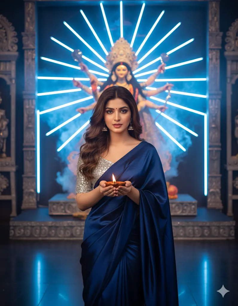 Ultra-realistic cinematic photo of a young woman in a midnight blue silk saree with silver blouse, standing inside a modern themed Durga Puja pandal. The background idol of Maa Durga is illuminated with blue neon lights and soft smoke effect. She is looking towards the camera with expressive eyes, holding a diya in her hand. Face glowing with soft reflection of lights. Photo size 9:16.