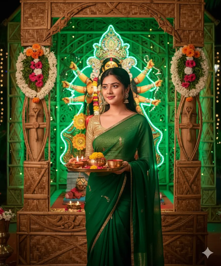 Realistic portrait of a young Indian woman in a green chiffon saree with golden blouse, posing in front of an eco-friendly bamboo crafted Durga pandal. Background idol is decorated with green LED lights and floral decorations. She is holding a decorated puja thali. Her glowing face shines softly under green-golden lights. Ultra-realistic, cinematic, size 9:16.
