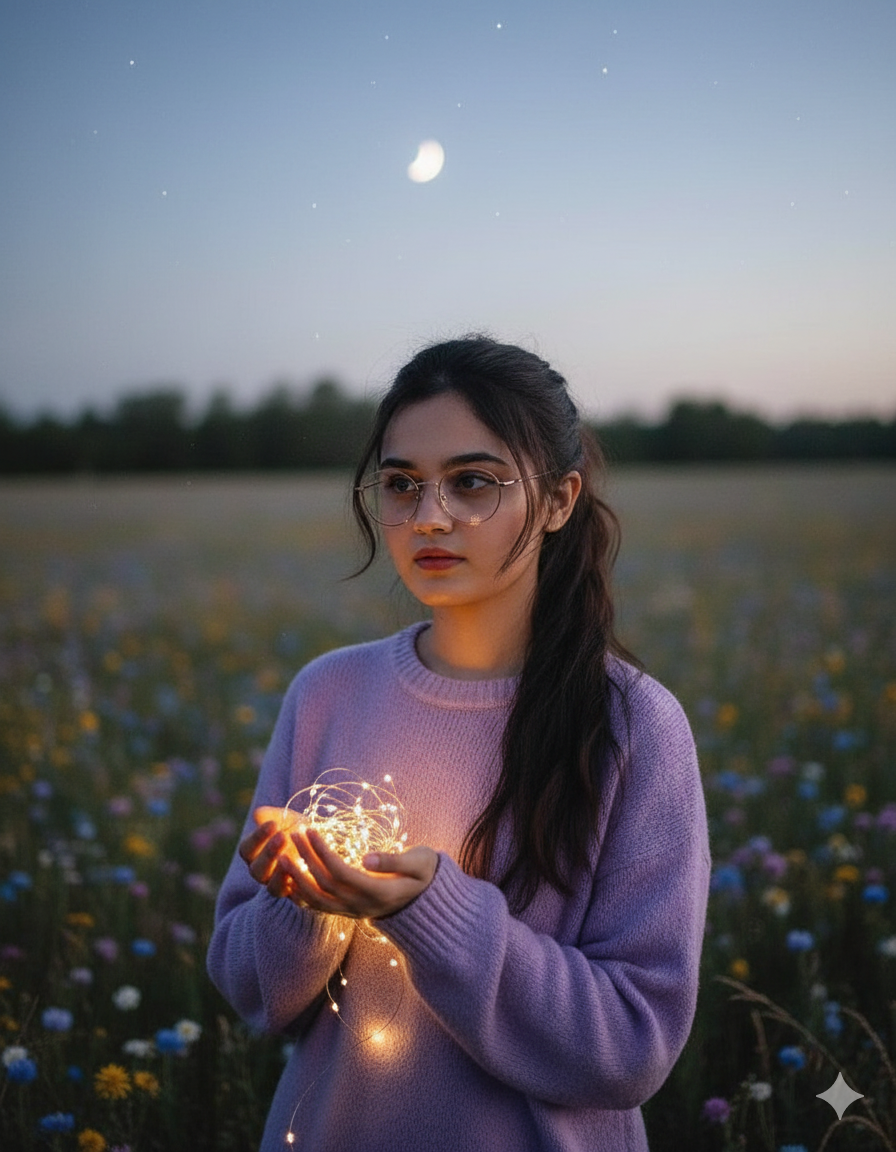 Cinematic, dreamy portrait outdoors in a meadow at dusk, holding tiny fairy lights. Hair messy ponytail, soft lavender sweater, wind lightly blowing. Background: blurred wildflowers and faint stars with crescent moon above. Fairy lights create warm reflections in her glasses. Mood: peaceful, mystical, intimate.
