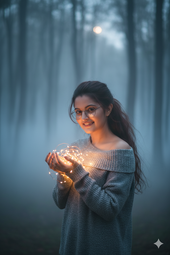 Cinematic moody portrait at early foggy morning near river, holding warm fairy lights. Hair in messy ponytail, soft cream sweater, reflections of lights in glasses. Background: blurred river, dense fog, faint moon peeking. Mood: mystical, dreamy, ethereal.