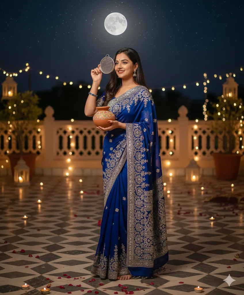 An Indian woman in a royal blue georgette saree with silver embroidery, standing on a decorated terrace with fairy lights. She is holding a karwa pot in her hands, gazing at the moon through a sieve. Background has stars and festive lights. 8K cinematic shot, portrait, 9:16 full screen.