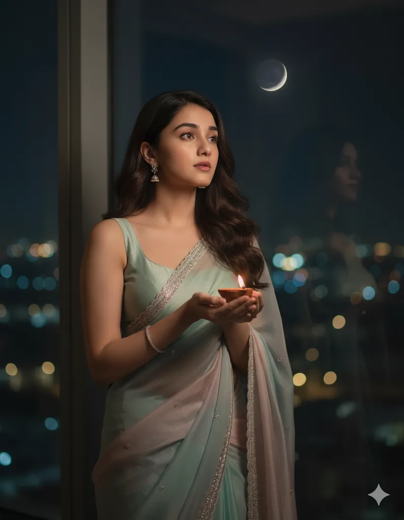 A modern Indian woman in a stylish pastel saree with sleeveless blouse, minimal jewelry, wavy hair left open. She is holding a glowing diya in her hands, standing near the window, looking at the moon. Soft bokeh lights in background. Cinematic 8K portrait, full screen 9:16.