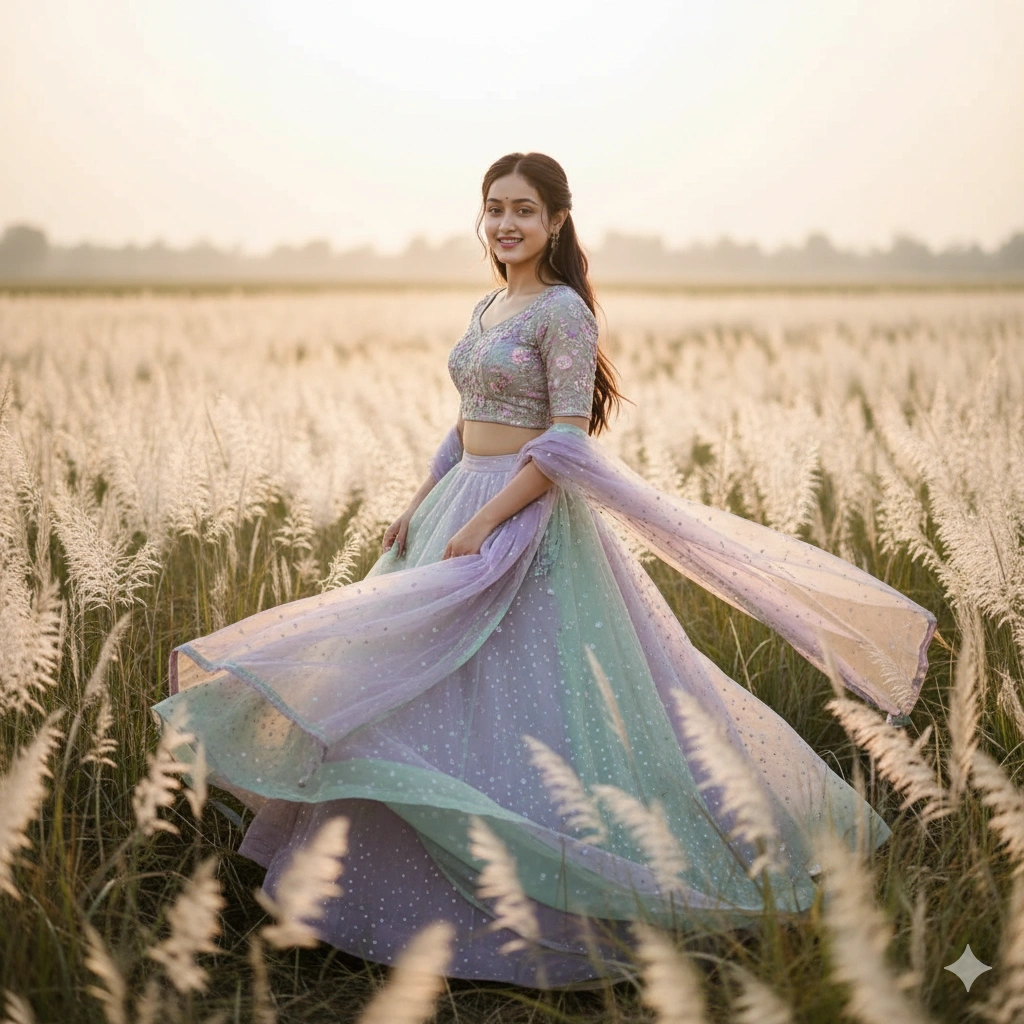 Create a highly realistic 8K UHD portrait (9:16) of the uploaded person standing in a Kashful field. Outfit is a pastel designer lehenga in shades of lavender and mint green, embroidered blouse with sheer dupatta. The lehenga flares beautifully with the wind. White Kashful grass creates a dreamy, fairytale background. Soft bokeh effect for cinematic beauty.