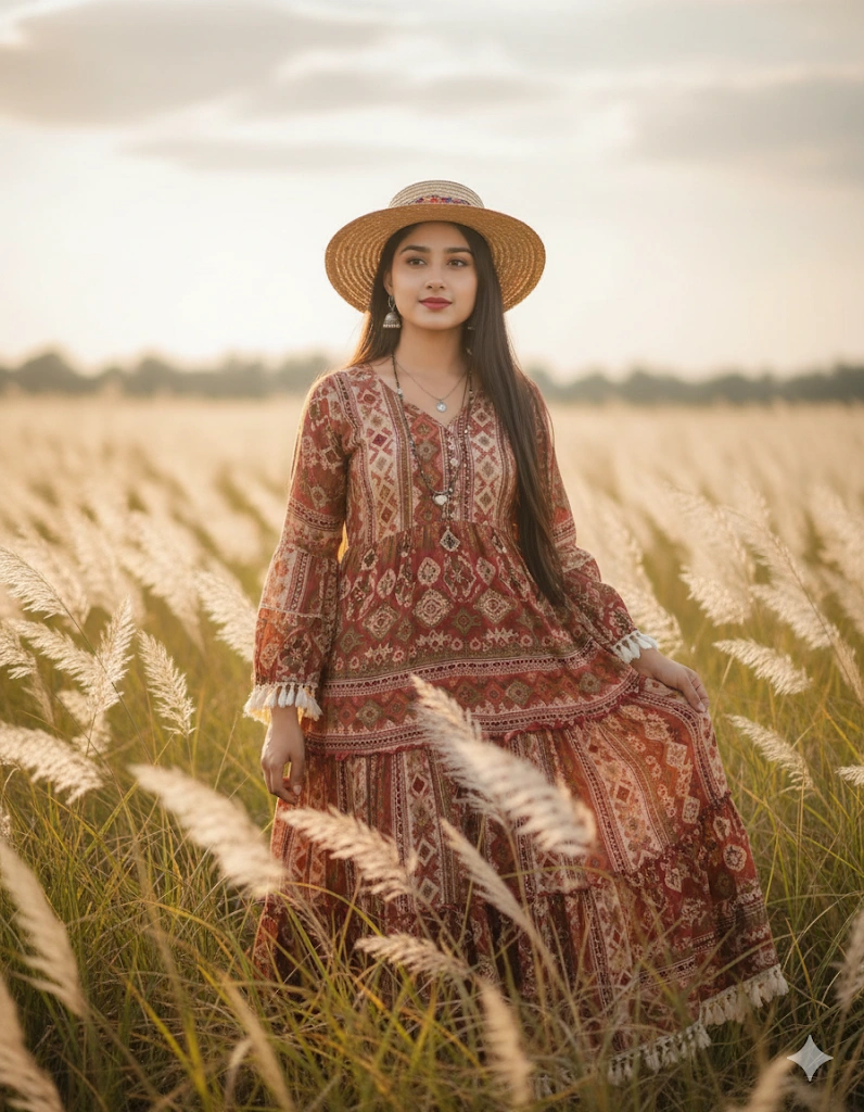 Create a full-screen UHD portrait (9:16) of the uploaded person in a Kashful field. Outfit is a bohemian long dress with earthy prints and fringes, paired with minimal jewelry and a wide-brim hat. Open hair flowing with the breeze, Kashful grass swaying around, creating a natural boho vibe.