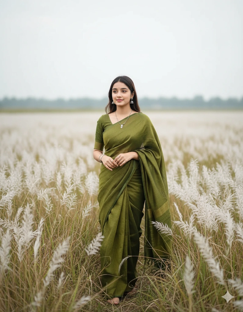 Create a UHD portrait (9:16) in 8K resolution. The uploaded person is wearing a handloom green saree with simple silver jewelry, standing barefoot in a Kashful field. Natural minimalistic style blends beautifully with the white Kans grass, giving an eco-friendly, nature-connected vibe.