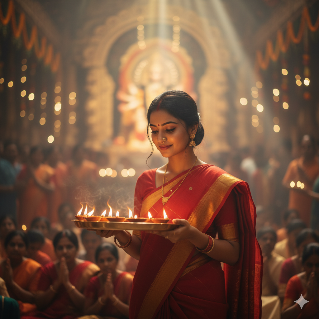 A cinematic 8K portrait of a young Indian woman wearing a simple red cotton saree with golden border, holding a brass thali with lit diyas, performing Durga Maa aarti inside a grand Navratri pandal. Her face glows in the warm light, clear and expressive, with hundreds of devotees blurred in the background. Cinematic lighting, festive atmosphere, ratio 9:16.