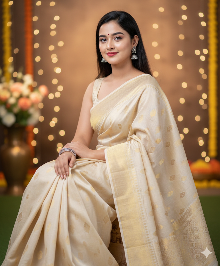 A professional studio-style 8K portrait of an elegant Indian girl wearing a cream-colored handloom saree with minimal jewelry. She is looking confidently at the camera with a soft smile, blurred natural festive background behind her. Clean, cinematic portrait lighting, ratio 9:16.