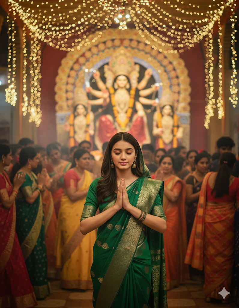 A cinematic 8K shot of a young Indian woman in a green saree standing in the middle of a crowded Navratri pandal, hands joined in prayer. The Durga idol is faintly visible behind her, while decorative lights and people create a vibrant atmosphere. Depth of field effect, vertical 9:16 frame.